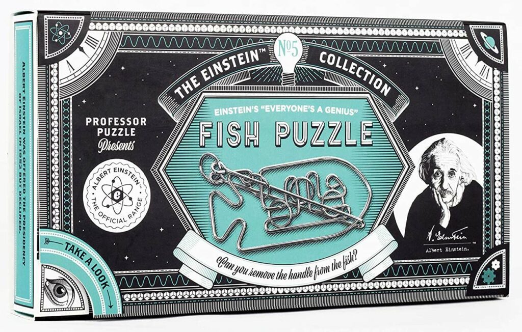 Bara en bit från Einsteins pusselsortiment. Kommer du att klara av detta knepiga pussel?” Alla är ett geni. Men om du dömer en fisk efter dess förmåga att klättra i ett träd, kommer den att leva hela sitt liv och tro att den är dum. ”Sätt din egen hjärna på prov när du försöker befria metallen från fisken och sedan fästa den igen.