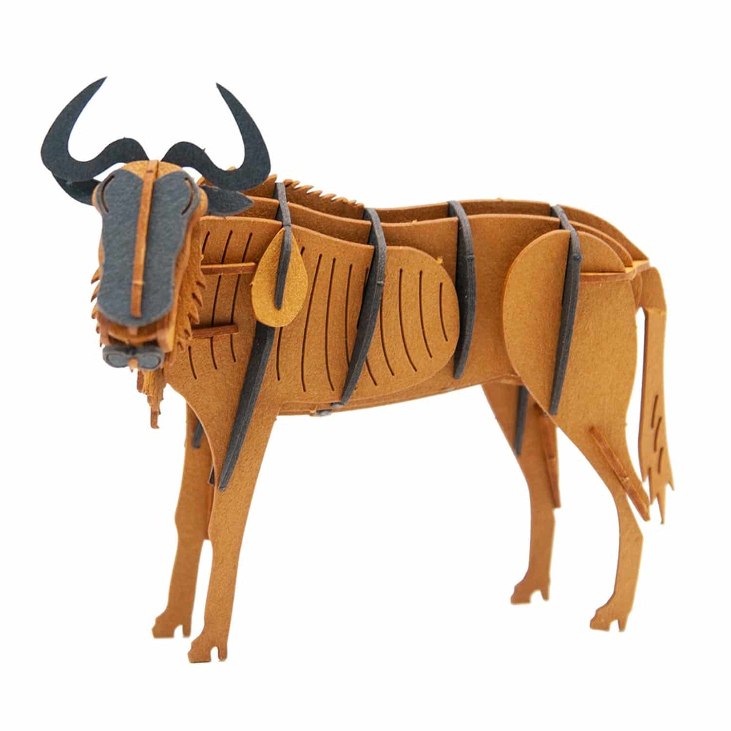 Vik, tryck ut och fäst ihop de förpräglade delarna i rätt ordning – inga saxar eller lim behövs. Steg för steg växer Gnu’s kropp fram; Där varje del är noggrant utformad för att ge realistiska konturer av päls, ansikte och ben.